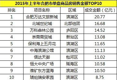2015年7月2日深夜,《2015年合肥單盤(pán)商品房成交金額排行榜》權(quán)威發(fā)布,上半年合肥樓市雖然有所下滑,整體呈現(xiàn)“價(jià)升量跌”的態(tài)勢(shì),但單盤(pán)商品房成交金額仍不乏亮點(diǎn),其中最引人注目的當(dāng)屬合肥萬(wàn)達(dá)文化旅游城,以20.77億元的絕對(duì)優(yōu)勢(shì)榮登榜首;而北城世紀(jì)城因體量巨大而以單盤(pán)商品房成交金額16.68億元位列第二;廬陽(yáng)區(qū)萬(wàn)科森林公園以高人氣高銷(xiāo)量獲單盤(pán)成交金額14.52億元排名第三。