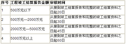 (2)審核工程竣工結算時限 發(fā)包人應按以下規(guī)定時限進行審核,并提出審核意見。
