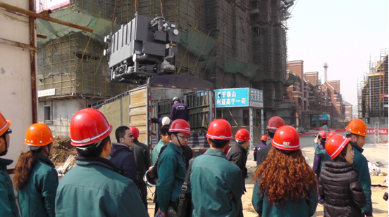 天下錦城采取集中供暖、供冷雙聯(lián)供中央空調(diào)形式,實(shí)現(xiàn)經(jīng)濟(jì)、節(jié)能、環(huán)保,此次施工的R4地塊空調(diào)建筑面積為7.2萬(wàn)平方米,空調(diào)主機(jī)位于9號(hào)樓地下室,主機(jī)下地下室和地下室路面拖運(yùn)是工程施工重點(diǎn)。吊裝的2臺(tái)空調(diào)主機(jī)搬入重分別是23T和7.4T,這樣的重量和高度要求讓施工現(xiàn)場(chǎng)氛圍緊張。過(guò)程中,領(lǐng)導(dǎo)們有條不紊組織、調(diào)動(dòng)著相關(guān)人員;操作人員認(rèn)真傾聽指示,聚精會(huì)神地操作設(shè)備;工作人員也是凝神聚力,全力配合做好各項(xiàng)工作。隨著吊裝機(jī)緩緩下降,兩臺(tái)溴化鋰機(jī)組一一被順利地放到目標(biāo)位置,天下錦城R4地塊雙聯(lián)供工程溴化鋰機(jī)組吊裝工程順利完成。